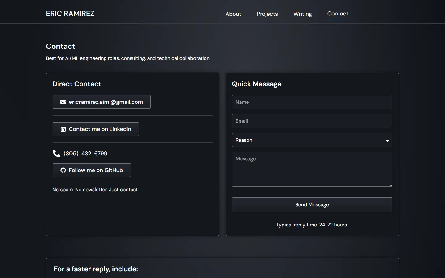 - Build a clean, professional personal website that serves as a central credibility hub for an AI/ML Engineer and PhD researcher.