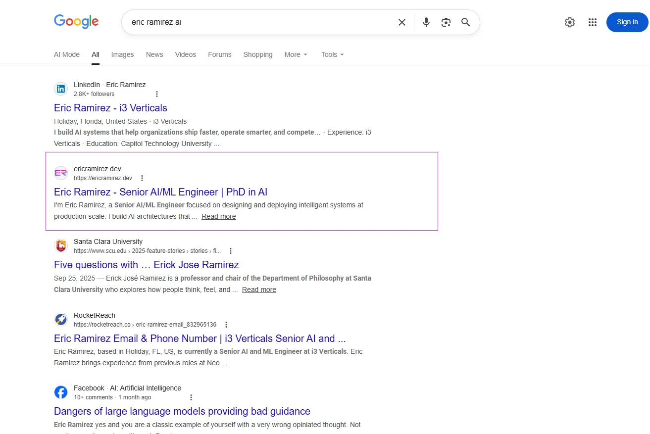 Now, on the internet, there are many people who share the name Eric Ramirez, and some of them are also software developers like him. We conducted basic research on his competitors and looked for ways to outrank them. As a result of our SEO efforts, we were able to get him to the top 2 on Google Search for the keyword “eric ramirez ai.”