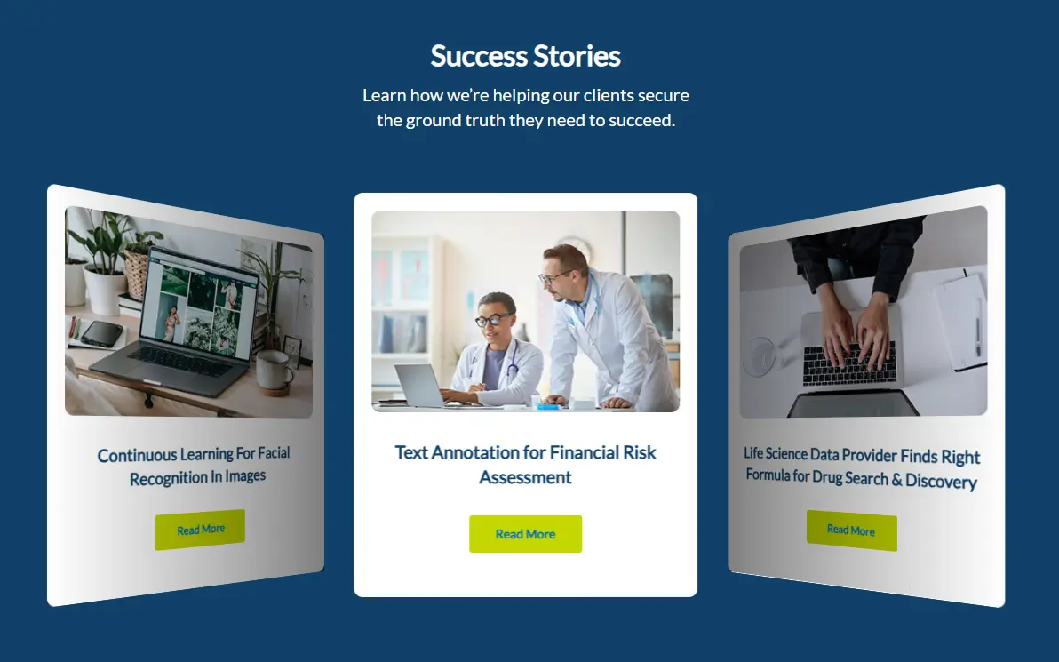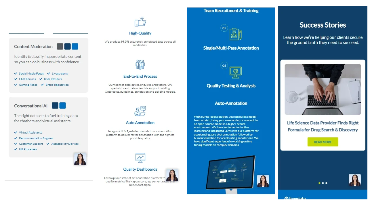 Improved Landing Pages: We rebuilt two of Innodata’s landing pages, Data Annotation and Generative AI, to modernize their appearance and enhance usability and performance. We worked closely with Innodata’s in house marketing and web design teams to plan and translate PDF design wireframes into fully functional HTML pages using Elementor, supported by custom CSS and JavaScript.