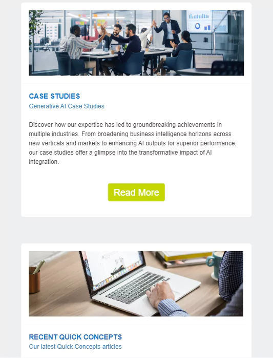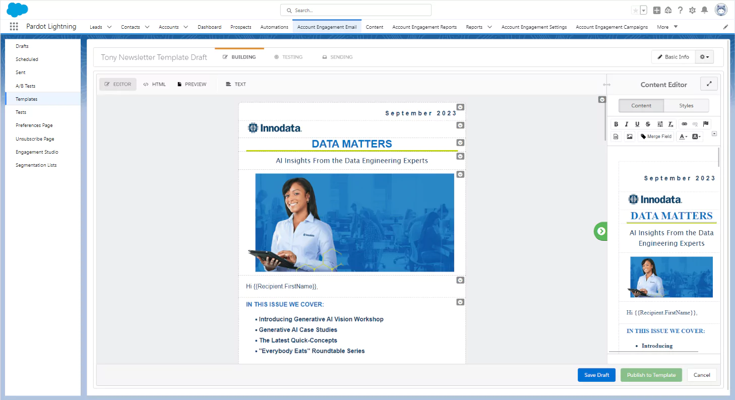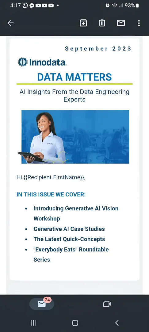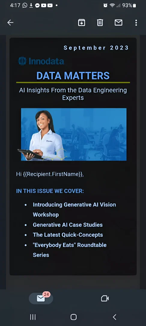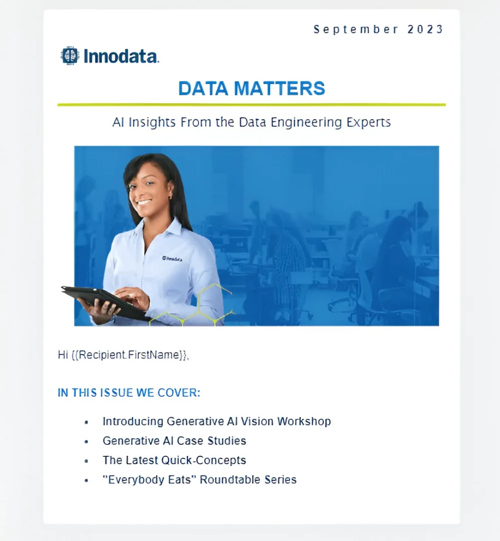 Responsive Email: We designed and built Innodata’s September 2023 marketing email using Salesforce Email Builder. Created from the ground up, the email was optimized for performance and ensured a seamless, fully responsive experience across all devices.